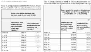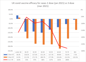 Zdaj že slavni “anticepilski teoretik zarote” El gato malo je iz uradno objavljenih številk o okužbah “cepljenih” in “necepljenih” v Angliji izračunal razliko v učinkovitosti drugega in tretjega odmerka med januarjem in marcem. Negativna učinkovitost tretjega odmerka je bistveno večja, kot je bila negativna učinkovitost drugega odmerka.
