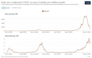 Slika: porast kovidnih okužb in kovidnih smrti na Danskem