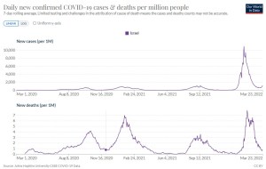 Slika: kovidne okužbe in kovidne smrti v Izraelu (“cepljenje” se je začelo 19.12.2020)